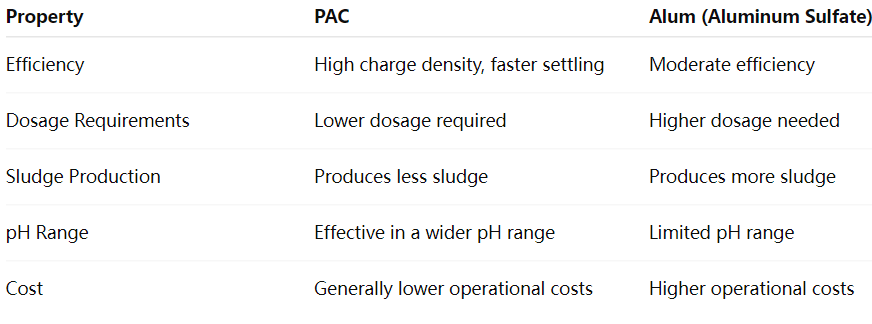 Na rozdíl od tradičních koagulantů, jako je kamenec (síran hlinitý), je PAC známý svou vynikající účinností a rychlejším usazováním v procesech úpravy vody. Má vysokou hustotu náboje, což je obzvláště účinné při destabilizaci suspendovaných částic a vytváření větších flokusů, které pak lze odstranit sedimentací nebo filtrací.